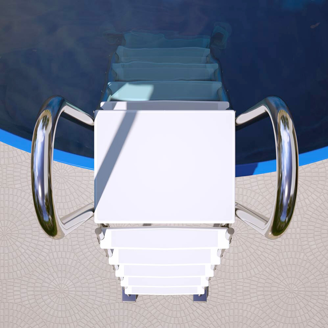 Die aussen liegenden Kunststoffstufen samt Holme werden bei Nichtgebrauch einfach abgenommen und sicher verwahrt. Der unbeaufsichtigte Zugang zum Pool durch Kinder oder Tiere wird deutlich erschwert, ohne die komplette Leiter aus dem Schwimmbecken nehmen zu müssen.