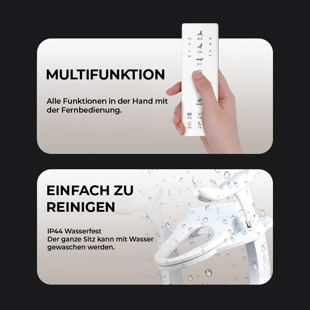 Die PRO-Version verfügt zusätzlich über eine integrierte Bidet-Funktion, die eine sanfte und hygienische Reinigung mit Wasser ermöglicht. Gerade für Menschen mit eingeschränkter Beweglichkeit bietet diese Funktion einen grossen Komfortgewinn im täglichen Alltag.
