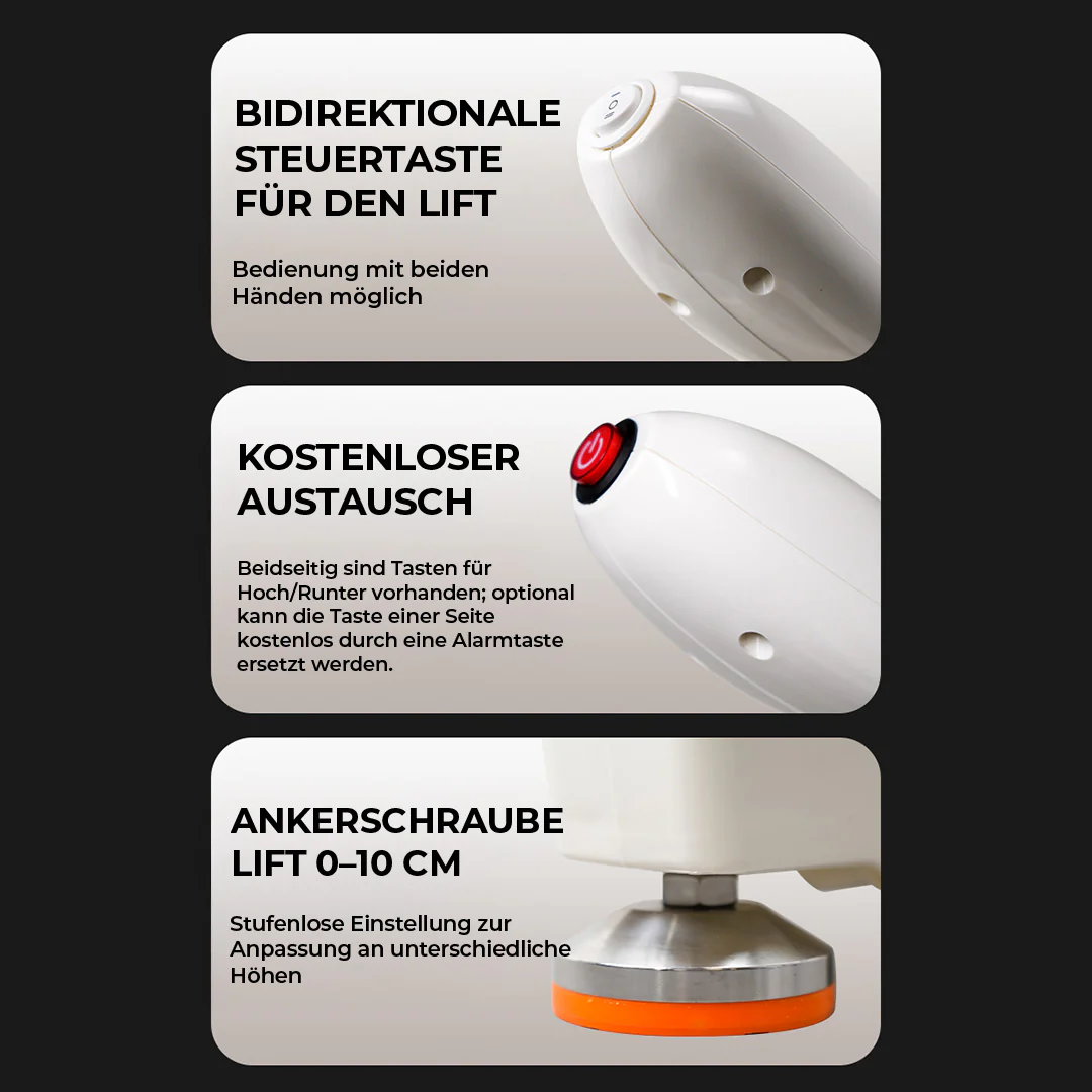 Die CareStyle elektrische WC-Aufstehhilfe unterstützt Menschen mit eingeschränkter Mobilität beim sicheren Aufstehen und Hinsetzen auf der Toilette. Durch eine intelligente Hubmechanik und stabile Konstruktion ermöglicht das System mehr Selbstständigkeit im Badezimmer – ohne aufwendige Umbauten oder bauliche Anpassungen.