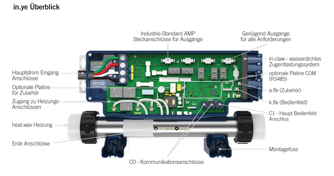 Breite Kompatibilität: Die in.ye-V3 Systeme sind mit einer Vielzahl von Gecko Bedienfeldern kompatibel (z.B. in.k300, in.k450, in.k500, in.k800, in.k1000 Serie) und bieten Anschlüsse für diverse Spa-Komponenten (Pumpen, Gebläse, Ozonator etc.).