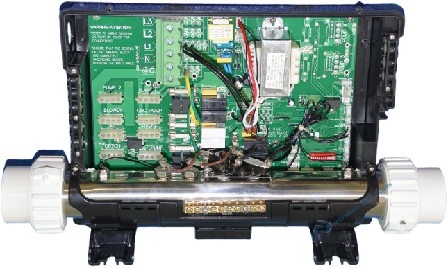 Diese Zusatzheizung (oder Nebenheizung) der Marke Balboa wurde für große Spas und / oder Installationen entwickelt, die eine schnellere Erwärmung erfordern. Die 3kW ergänzen die Wirkung der Hauptheizung auf eine Gesamtleistung von 6kW. Trotz seines Aussehens ist es kein eigenständiges Steuerungssystem und muss an ein Hauptsteuergerät angeschlossen werden. Es verfügt über eine eigene einphasige 230-V-Stromversorgung und die Verbindung zur Steuerung erfolgt über ein ca. 120 cm langes Kabel mit Kabelschuhen. Die Kabelschuhe werden ohne Polarität an die Steckplätze J100 und J101 eines Balboa-Steuerungssystems der GS- oder GL-Serie oder an die J48- oder J49-Ausgänge eines BP-Seriensystems angeschlossen. Mit etwas Bastelarbeit kann man diese Heizung auch an andere Arten von Steuerungen anpassen.