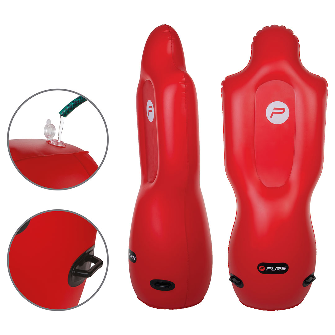 Die wassergefüllte Basis sorgt dafür, dass der Dummy immer wieder aufsteht, wenn der Ball ihn trifft oder er angerempelt wird. Das Aufstellen dauert lediglich ein paar Minuten. Fülle einfach die Basis mit Wasser und blase den Verteidiger auf den erforderlichen Druck auf. Das Material ist sehr widerstandsfähig. Die Tragegriffe an den Seiten erleichtern den Transport.
