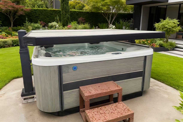 Der PoolKing Cover Lifter ist ein vollautomatisches Hubsystem zur Abdeckung von Swimspas und Whirlpools. Die mehrgliedrige, motorisierte Konstruktion hebt und senkt die Abdeckung per Knopfdruck in wenigen Sekunden. Im geschlossenen Zustand wird der Pool vor Laub, Schnee und Schmutz geschuetzt, gleichzeitig wird der Energieverbrauch durch geringere Wärmeverluste reduziert.