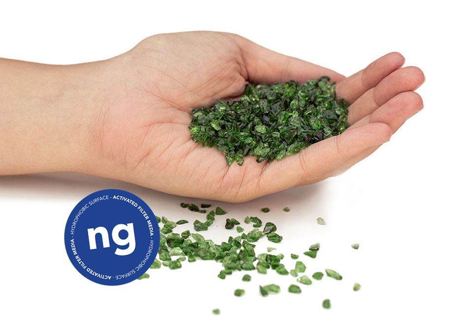 AFM® (Activated Filter Media) ist ein direkter Ersatz für Sand in Sandfilter. Zur Herstellung von AFM® wird nur grünes und braunes Recycling-Glas verwendet. Nur dieses Glas enthält die Metalloxide, welche es im Rohmaterial braucht, um ein bioresistentes Filtermaterial zu erzeugen. Das Glas wird gewaschen, gebrochen, gesiebt und zum Schluss in einem 3-stufigen Aktivierungsprozess veredelt. Dadurch erreichen wir Bioresistenz sowie die einzigartige Adsorptions- und Filtrationsleistung von AFM®.